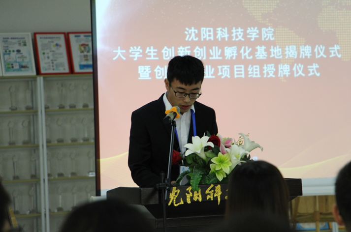 我校创新创业教育优秀学子、入驻公司代表霍超同学也做了精彩发言。他感恩学校为大家提供了窗明几净、温馨惬意的办公环境和专业的指导老师,使同学们天马行空的想法能够在我校大学生创新创业孵化基地的这片沃土上真正的落地开花!