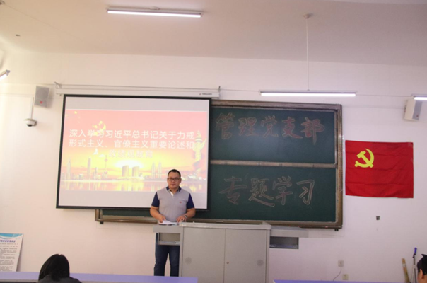 9月25日,管理党支部在第二教学楼303教室开展了以“力戒形式主义官僚主义重要论述和政绩观教育”为主题的教育大会。会上,支部书记赵恩领读了中共中央办公厅印发的《关于解决形式主义突出问题为基层减负的通知》,着重强调在以习近平同志为核心的党中央坚强领导下,全党上下同形式主义、官僚主义作坚决斗争,广大党员牢固树立“四个意识”,切实做到“两个维护”的坚定意志和行动自觉不断得到增强提升。宣传委员蒋明儒表示,对于基层面临的形式主义、官僚主义困扰,习近平总书记能做到见微知著、明察秋毫,支部更要彻底贯彻力戒形式主义官僚主义思想,放下架子、扑下身子,接地气、通下情,用心倾听呼声,用真情回应关切,用行动践行诺言。与会的各位党员同志,也纷纷结合工作实际进行了主题发言。