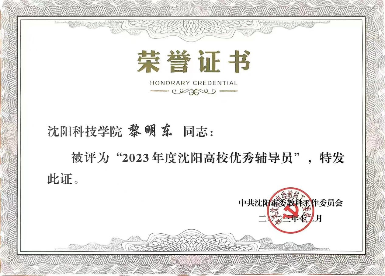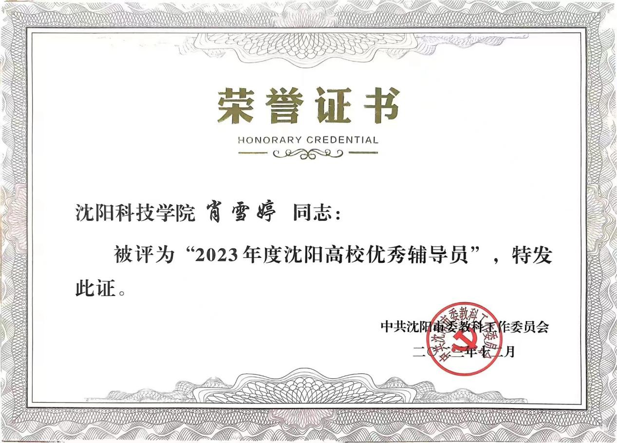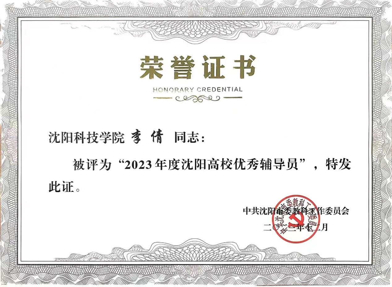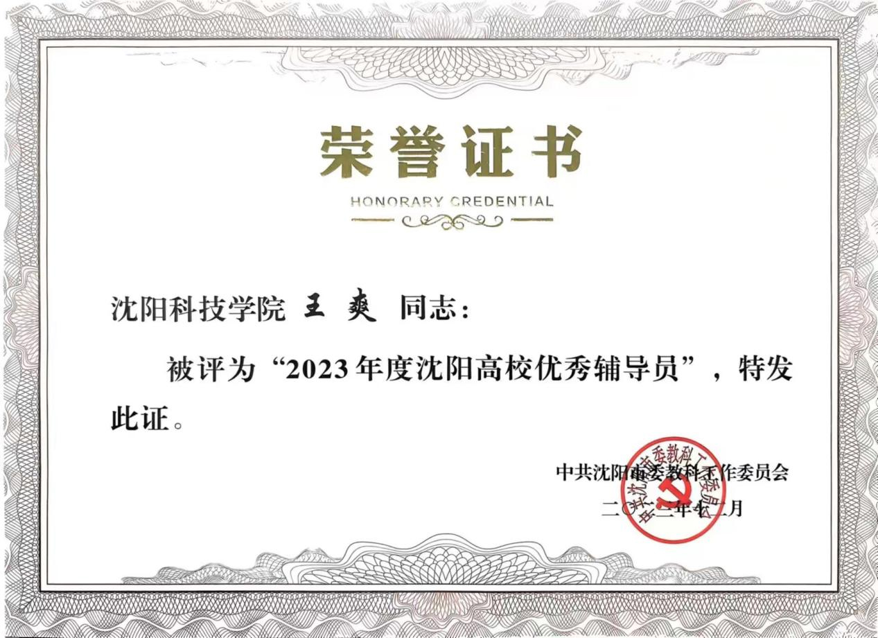 近日,中共沈阳市委教科工作委员会组织开展了“2023年度沈阳高校优秀辅导员、优秀新利18备用官网干部”评审工作。经个人申报、系部推荐、校内评审、学校推荐、专家审核,我校辅导员王爽、田野、杨阳、李倩、黎明东、蒋明儒、肖雪婷荣获“2023年度沈阳高校优秀辅导员”荣誉称号。我校宋和发、施芳芳、李金霖荣获“2023年度沈阳高校优秀新利18备用官网干部”荣誉称号。
