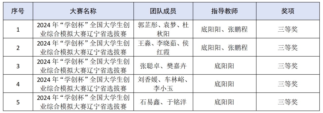 在2024年“学创杯”全国大学生创业综合模拟大赛辽宁省选拔赛中,获得省级三等奖5项。
