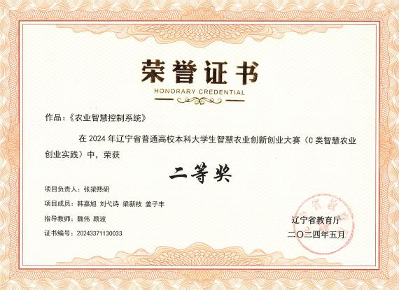 在2024年辽宁省普通高校大学生智慧农业创新创业大赛中,获得二等奖2项、优秀奖3项。