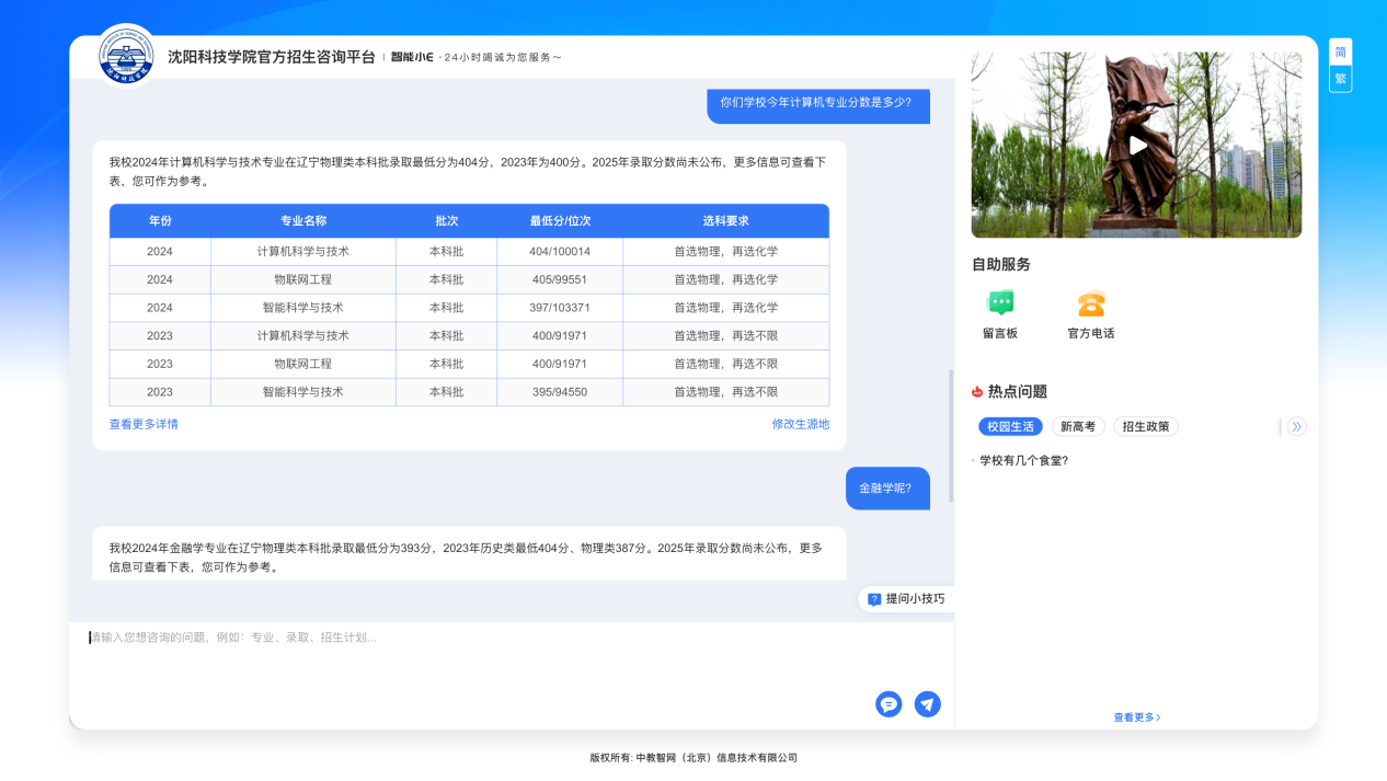 问答示例:当你问“你们学校今年计算机专业分数是多少?”“金融学呢”时,系统能凭借DeepSeek大模型的逻辑分析能力,记住对话上下文信息,准确识别考生的咨询意图与前轮对话内容,为你提供更连贯、更精准的回答!