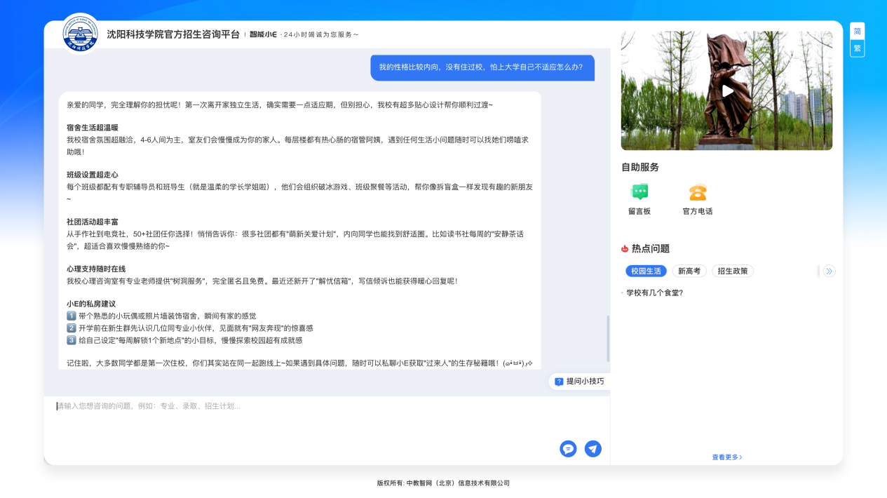 面对复杂的志愿填报、招生政策,或是关于校园生活的点滴疑问,现在只需向“智能机器人小E”咨询,我们的智能问答系统依托DeepSeek大模型的强大语义理解能力,可以迅速识别你的咨询意图,进行精准回答。