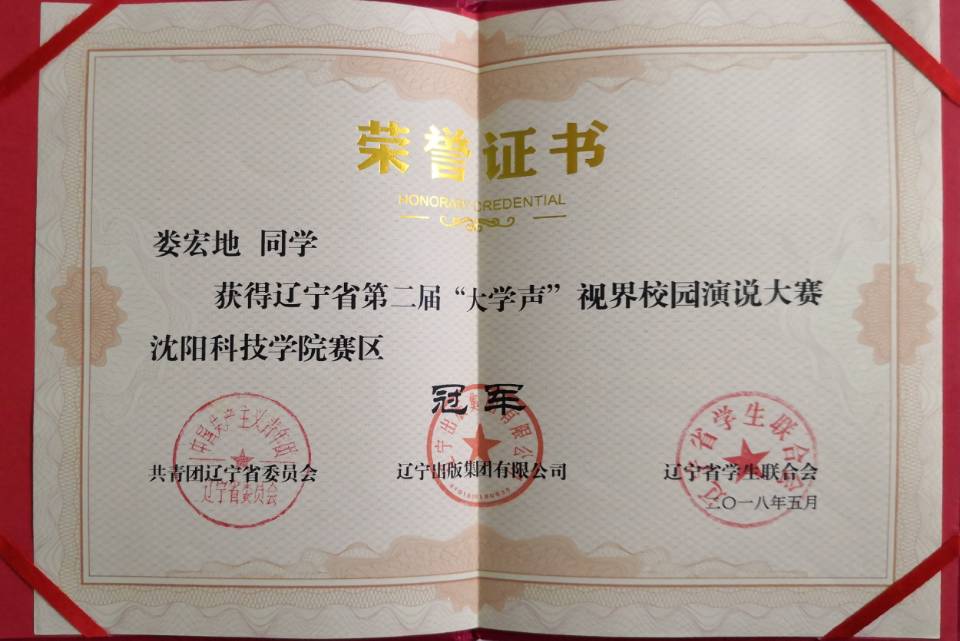 日前,由辽宁出版集团、共青团辽宁省委员会、辽宁省学生联合会共同打造的第二届“大学声视界”校园演说大赛落下帷幕。我校管理系会计1701班娄宏地同学荣获新利国际赛区冠军。